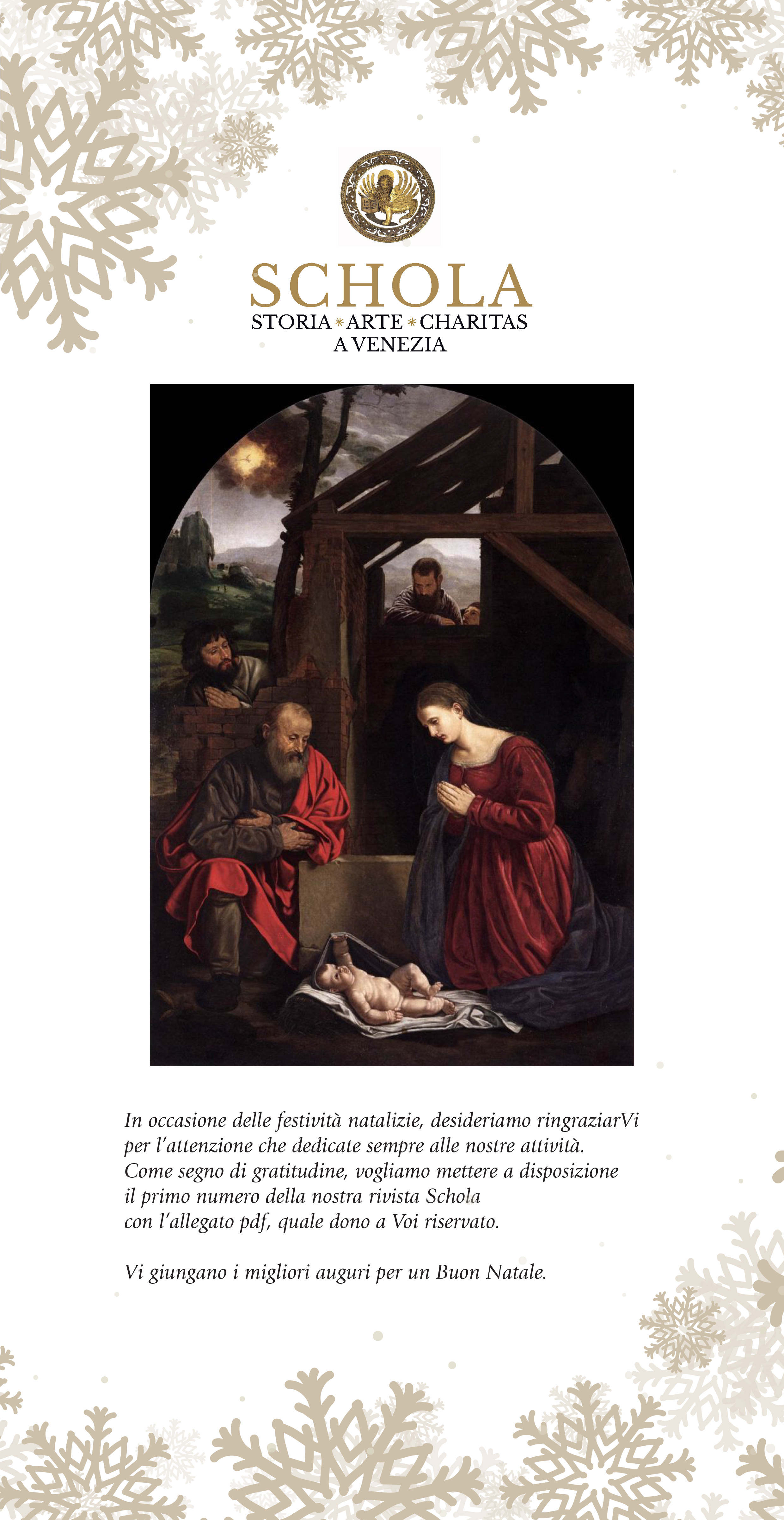 In occasione delle festività natalizie, desideriamo ringraziarVi per l'attenzione che dedicate sempre alle nostre attività. Come segno di gratitudine, vogliamo mettere a disposizione il primo numero della nostra rivista Schola con l'allegato pdf, quale dono a Voi riservato.
